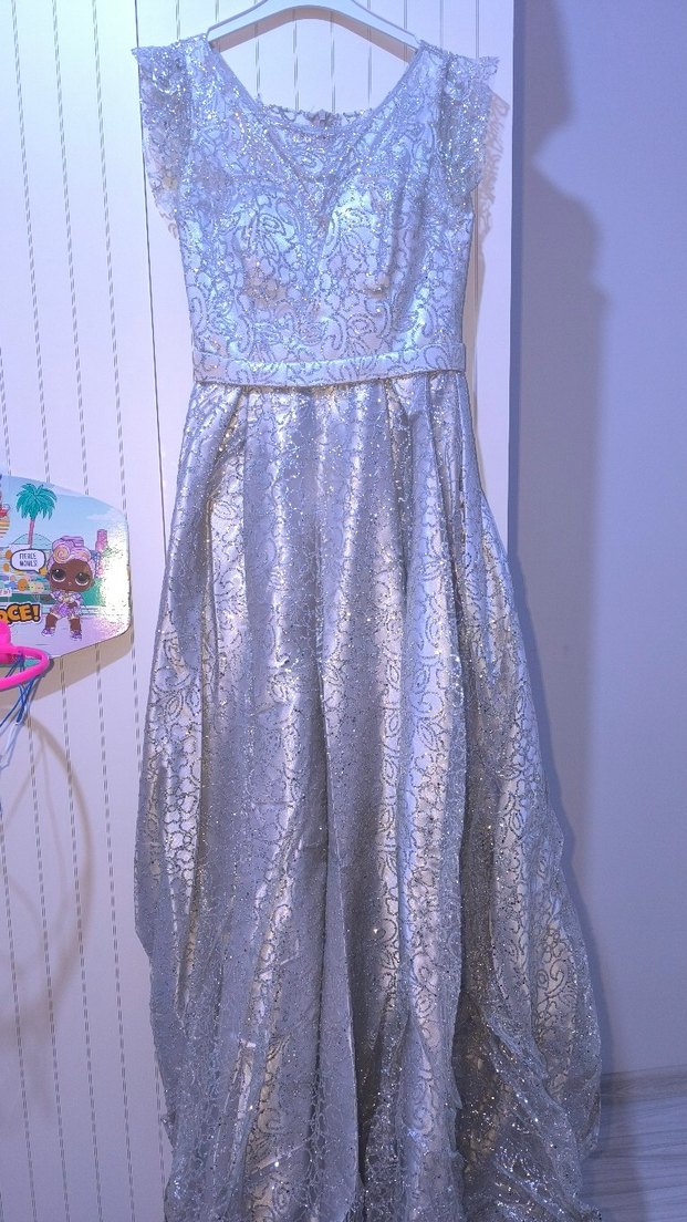 Bu uzun gri abiye elbise, drapeli tasarımı, straplez yakası ve bol kesimi ile düğünler için uygun. Desensiz ve hafif vintage tarzda.
