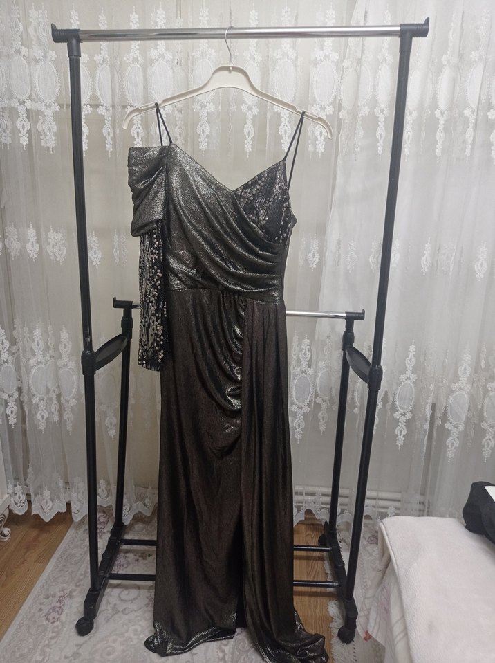 Fitted kesim, uzun boylu gri renkte drapeli, straplez ve ince askılı kadın abiye elbise, düğünler için uygun. harika esnek kumaş kendinden simli yırtmaçlı isterseniz yırtmacı dikilir. önündeki pelerinde kapatıyor 1 defa giydim