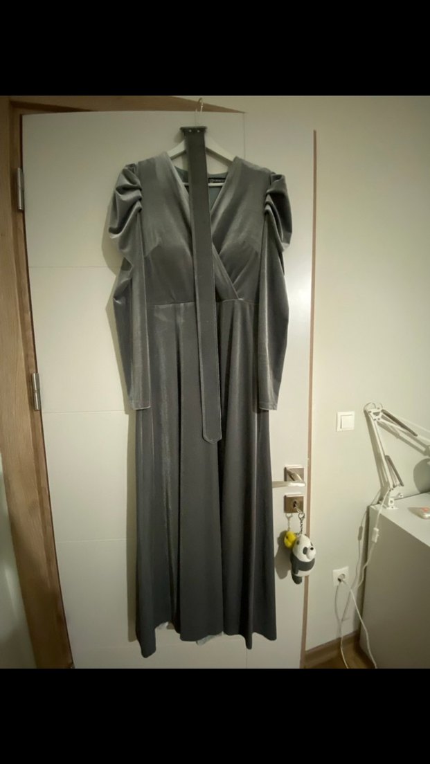 Gri uzun elbise, drapeli tasarımı, V yaka ve askılı kollara sahiptir. Sentetik kumaştan yapılmış, avant-garde ve şık bir görünüm için regular fit sunar. Ofis kullanımı için uygundur.
