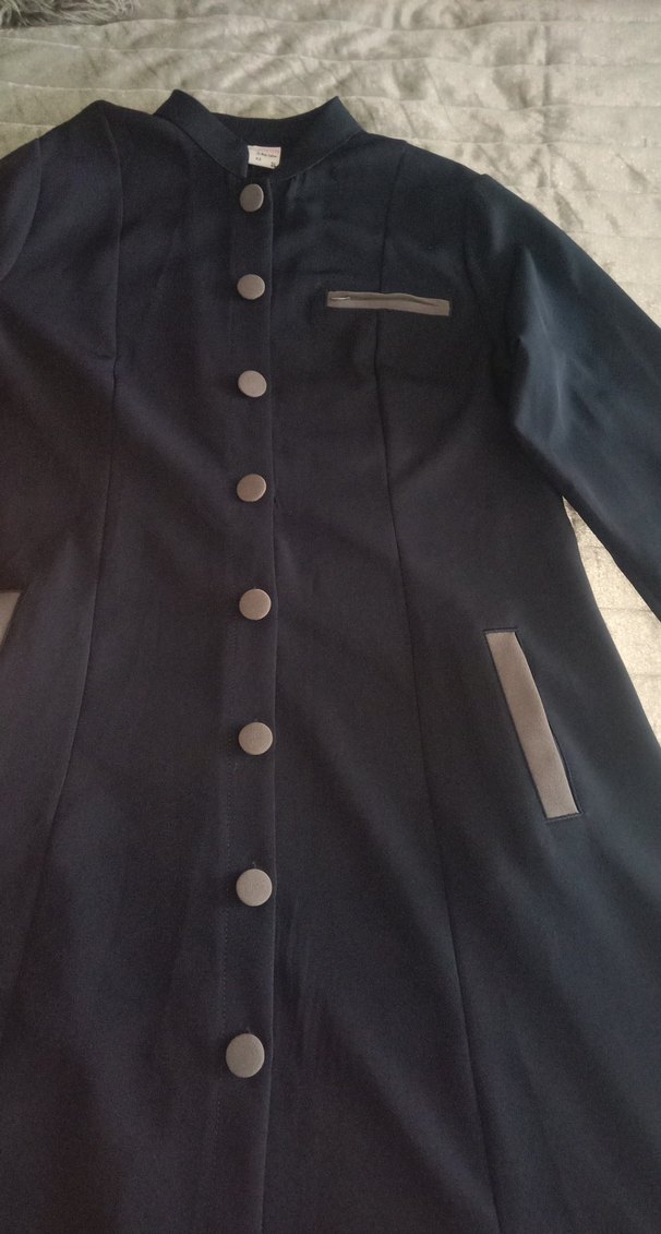 Gri uzun düğmeli hamile kaban, sentetik kumaştan, notched lapel yakalı ve regular fit. Ofis için uygun, goth tarzında bir parça.
