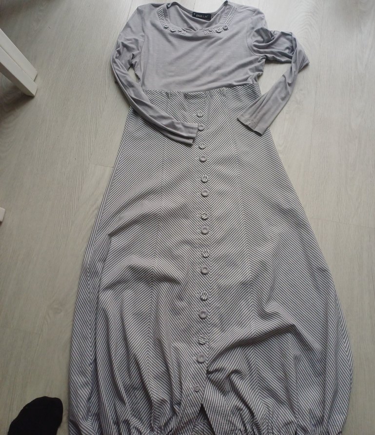 Gri renkli, düğmeli uzun elbise, bol kesim ve yuvarlak yaka ile rahatlık sunar. Paris tarzı ve sade dokusu dikkat çeker. kapşollu yelegi vardır 2 li takım dır 130 boy