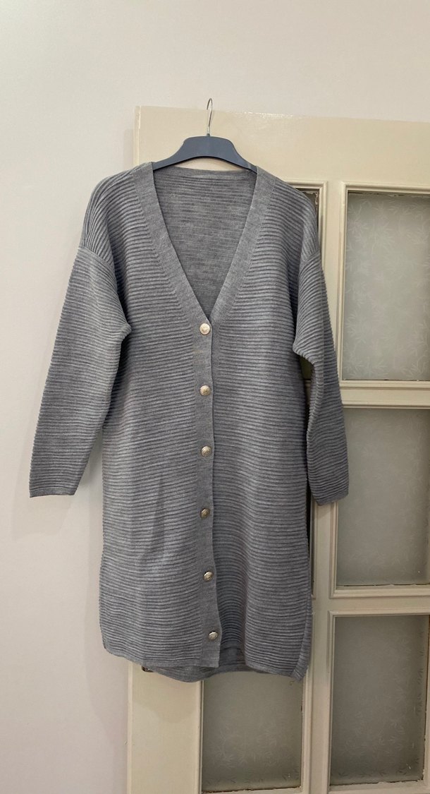 Gri renkli, uzun ve düğmeli kadın hırkasıdır. Rahat kesimi, uzun kolları ve yakasıyla günlük kullanıma uygundur.