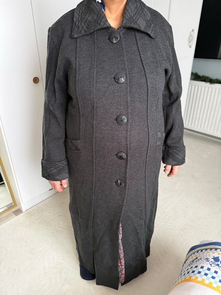 Kadın kaban, düğmeli ön ve uzun kollu, yumuşak ve sıcak kumaştan, düz gri renkte, günlük kullanım için uygun.