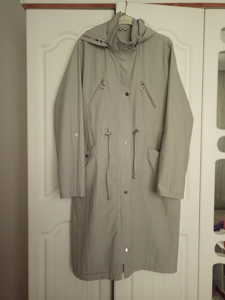 Gri uzun yağmurluk, düğmeli kapama ve çıtçıt detaylarına sahip. Keten kumaştan, salaş kesim ve minimal tasarımlı, günlük kullanıma uygun.