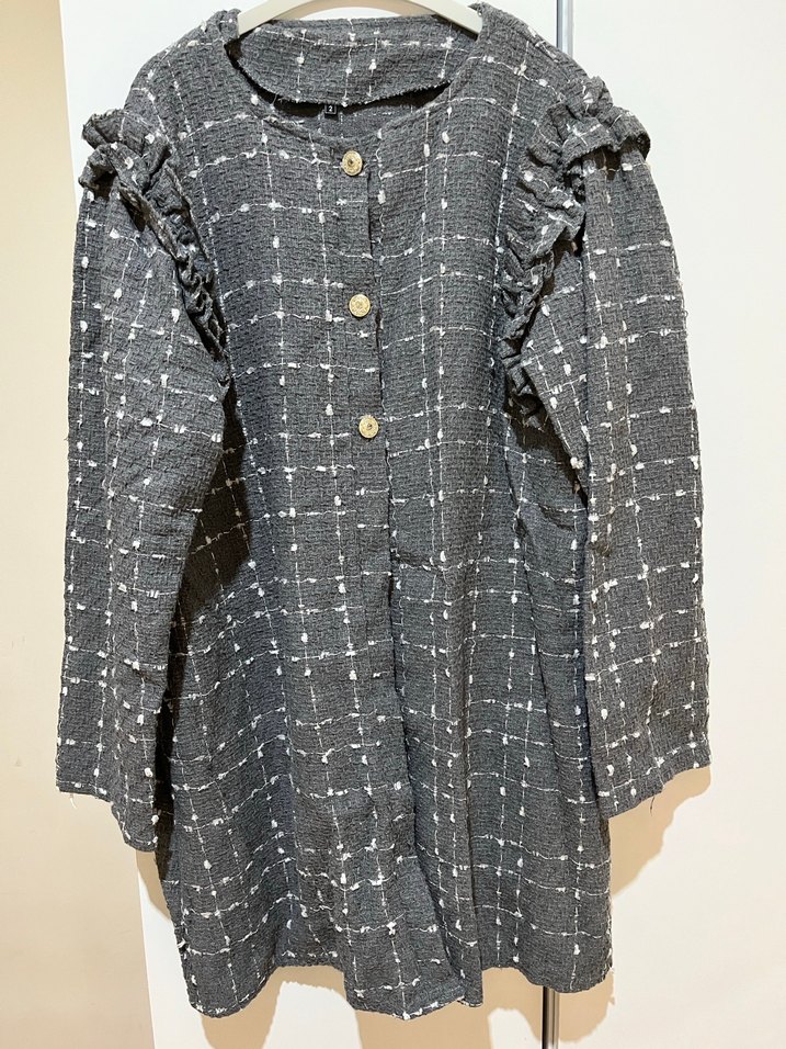 Gri renkli, keten kumaştan uzun ve düğmeli kadın kaban. Uzun kollu, kruvaze yakalı ve kareli desene sahip, bol kesim takım 38-40.ç beden uyumlu sadece 1 defa gıyıldı