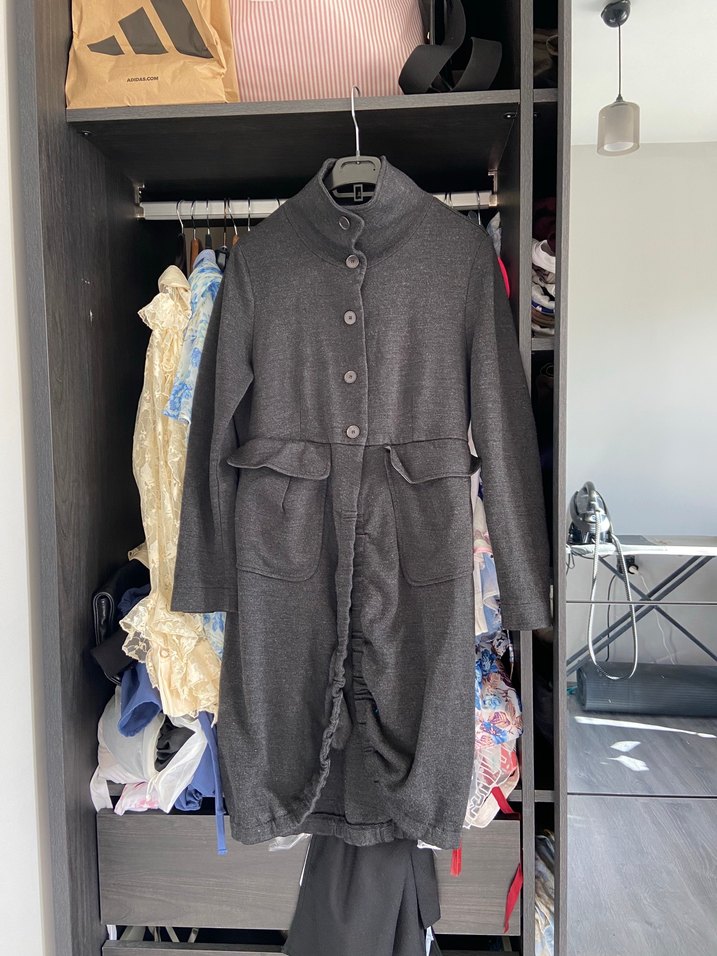Gri uzun hamile kabanı, düğmeli ve cepli tasarımı ile rahat bir görünüm sunar. Yumuşak kumaştan, uzun kollu ve yakalıdır. Günlük kullanıma uygundur.