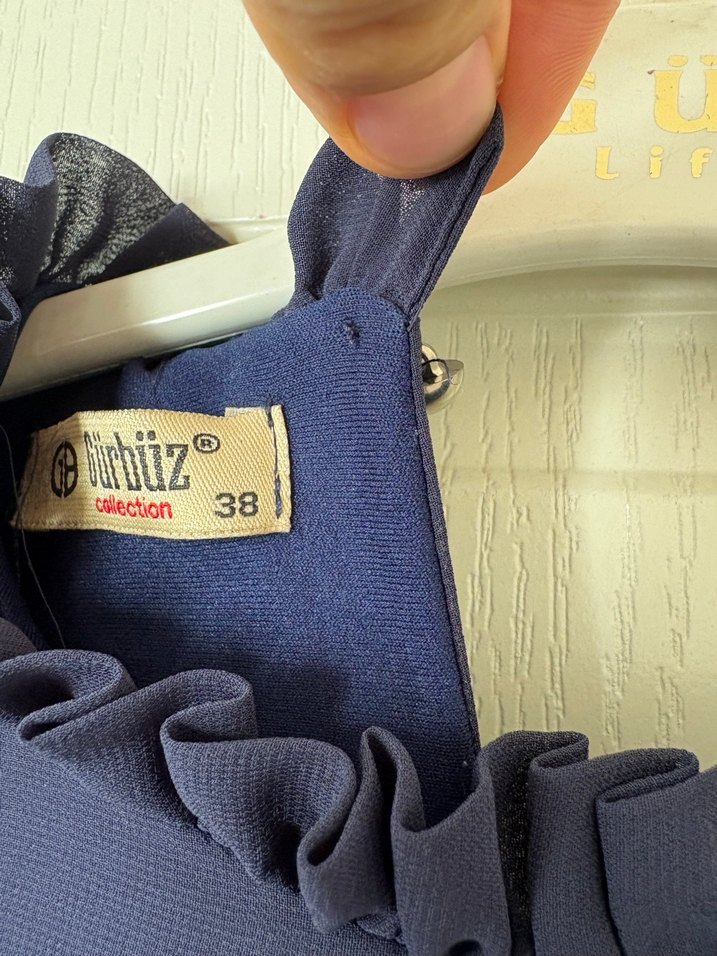 Mavi bebek taşıma slinginde yumuşak kumaş ve ayarlanabilir tasarım bulunur. Üzerinde 38 numara ve Düztüz collection etiketi yer alır.