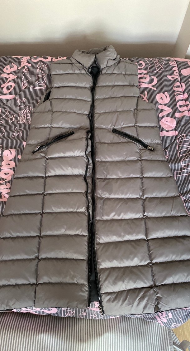 Gri renkte, uzun kesim, fermuarlı cepleri ve yüksek yakası olan, sentetik kumaştan yapılmış, sokak stili için uygun, fitted kesim kadın yelek.
