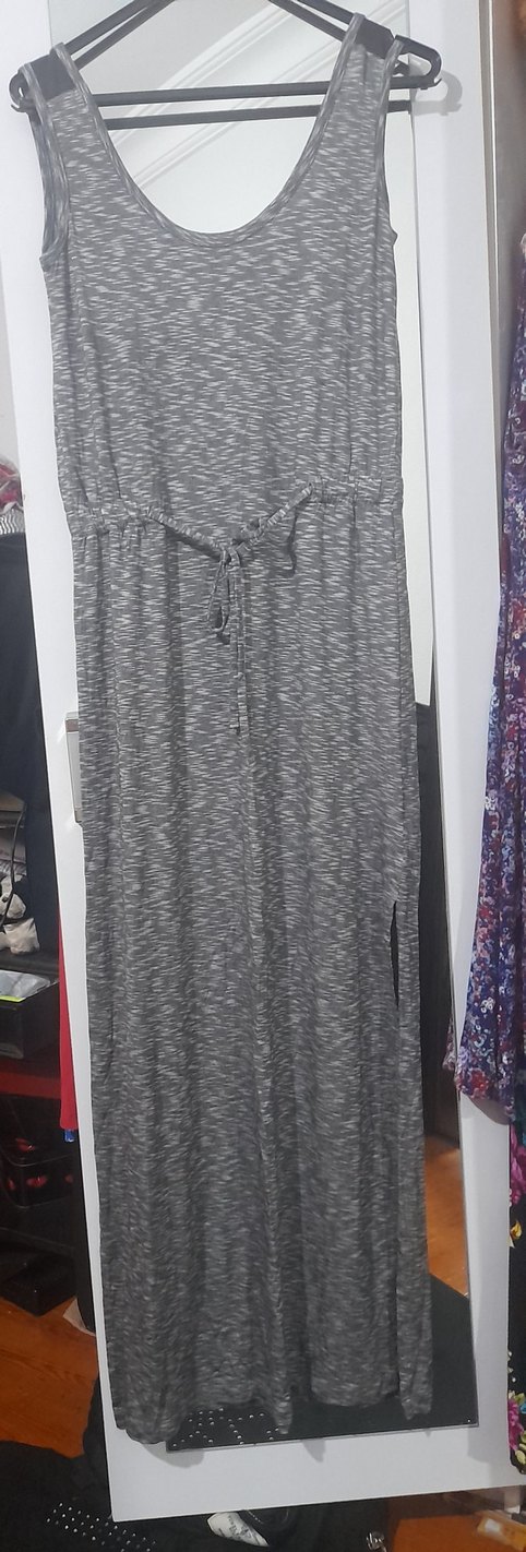 Gri renkte, askısız yakaya sahip, bol kesim elbisesi. Yumuşak sentetik kumaştan, günlük rahat kullanım için uygundur.
