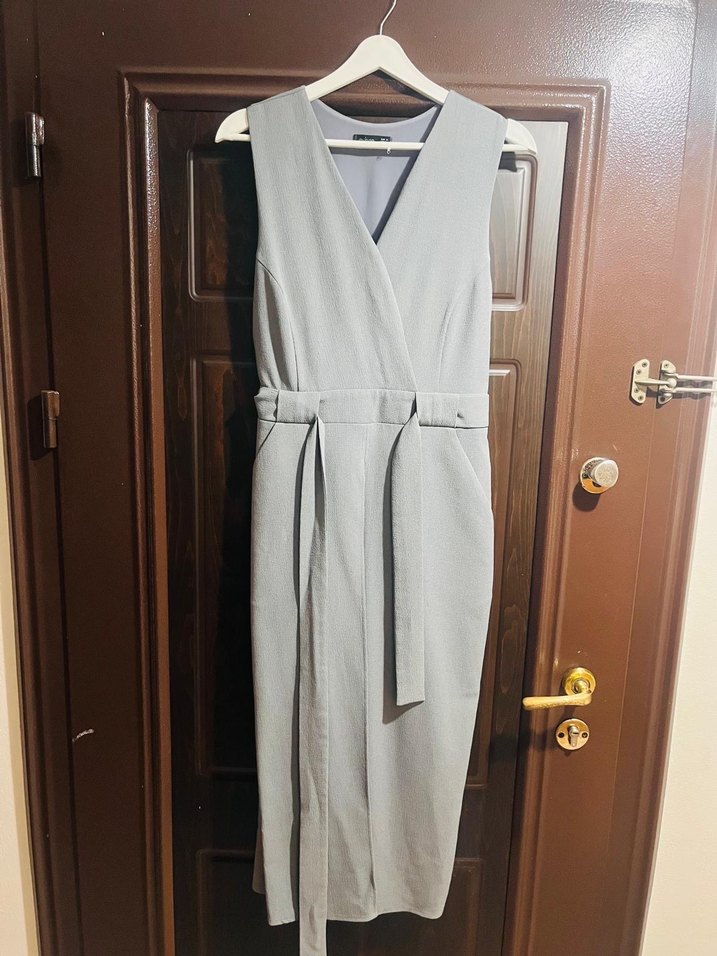 Gri renkli, uzun hamile tulumu, notch yaka, askılı kollar ve yırtmaç detayına sahiptir. Regular fit ve minimalist normcore tarzıyla ofis için uygundur. Sentetik kumaştan üretilmiştir.