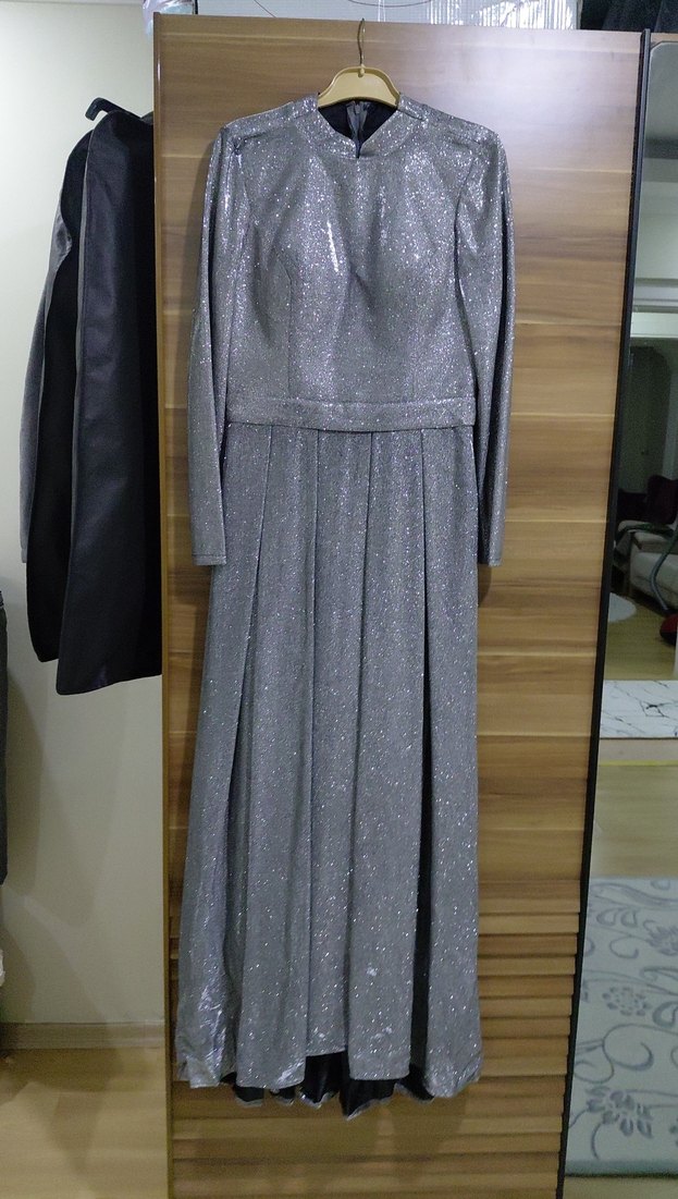 Bu uzun gri abiye elbise, kesik yakası ve uzun kollarıyla modern klasik stil sunar. Düğünler için uygundur. ✨ göğsü pedli nişanımda bir kere giymiştim