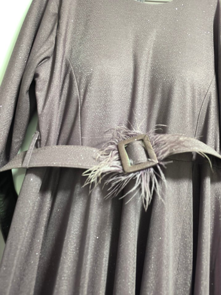 Gri uzun abiye elbise, tek renk ve dar kesimdir. Tekne yakalı, askılı kollu ve kuşak kısmında tüy detayları bulunur. Gotik ve avangart tarzda, özel davetler için uygundur.