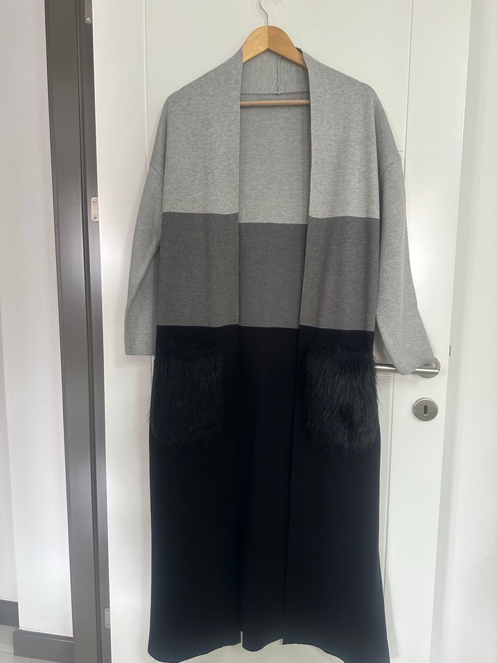 Gri uzun kadın hırka, salaş kesim ve uzun kollu, yumuşak kumaştan üretilmiş. Notlu yaka ve kürklü cepleriyle konforlu ve şık bir parça.