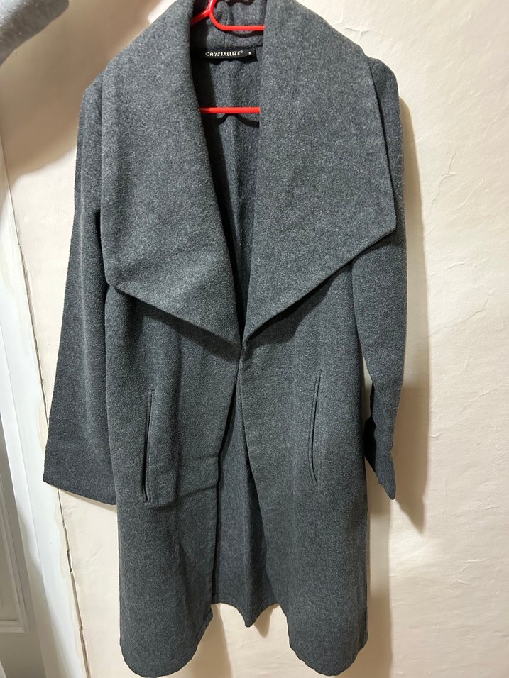 Bu gri uzun kadın kaban, geniş yakası ve ön cepleriyle yumuşak, sıcak kumaştan yapılmıştır. Serin havalar için uygundur.