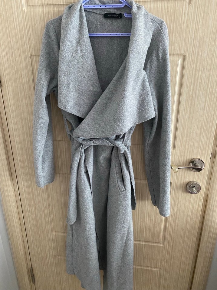 Gri uzun kadın kaban, drapeli yaka ve kemerli düz kesimlidir. Uzun kollu, yumuşak ve sıcak kumaştan yapılmıştır, rahat kullanıma uygundur.