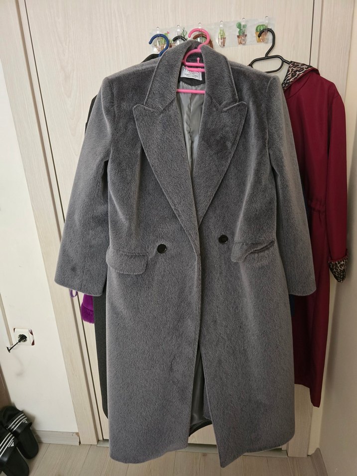 Yumuşak peluş kumaştan yapılmış, çift düğmeli, cepli, uzun gri kadın kaban. Yapılandırılmış yaka ve rahat iç astar bulunur.