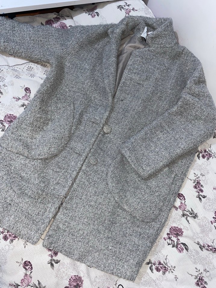 Yumuşak dokulu, gri uzun kadın kaban, önünde iki cep ve düğme kapamalı. Soğuk havalar için sıcaklık ve konfor sağlar.