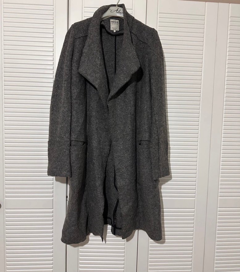 Gri uzun kadın kaban, yumuşak ve sıcak bir kumaşa sahiptir. Salaş, açık ön tasarımı ve uzun kollarıyla rahat bir kullanım sunar.