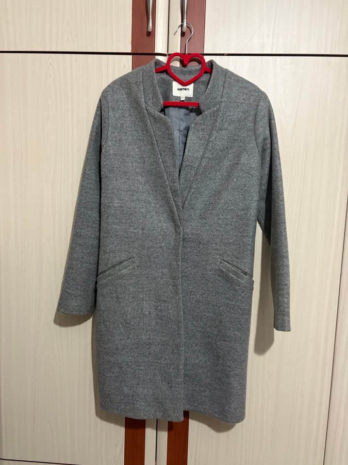Gri renkli, uzun kadın kabanı, yumuşak ve sıcak kumaştan üretilmiş, yakasız sade tasarıma ve iki ön cebe sahiptir.