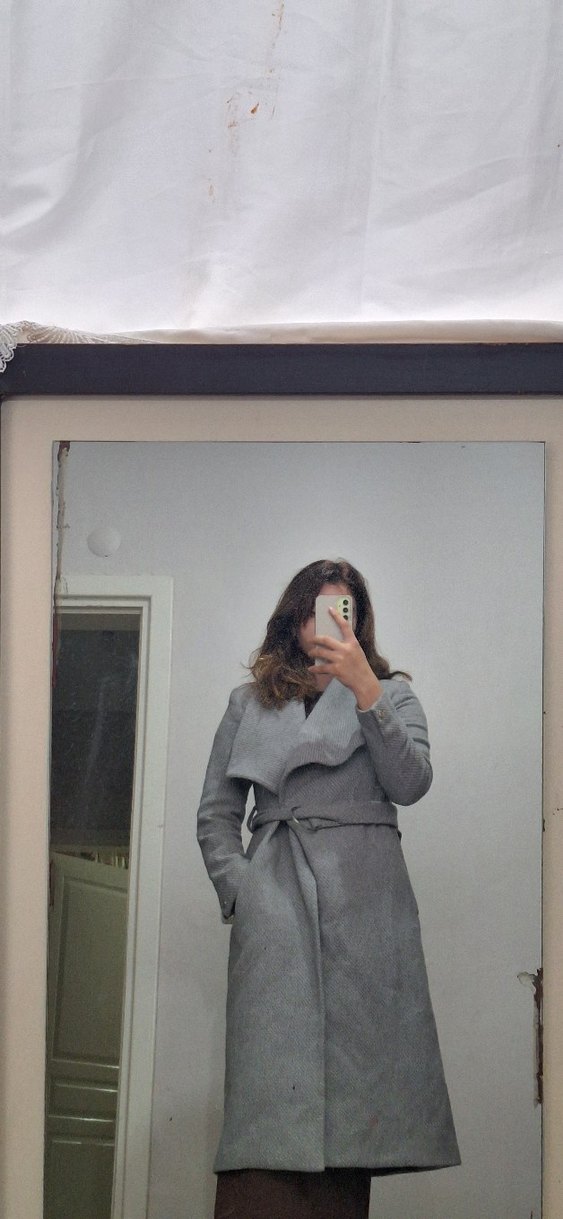Gri uzun kadın kaban, kesik yaka ve uzun kollu, vücuda oturan kesime sahiptir. Yumuşak ve sıcak kumaştan yapılmış, günlük kullanım için şık ve sade bir tasarımdır. ayrıca kabanı inceledim arka yirtmacinca fark edilmicek kadar küçük yırtık var fotoğrafa koydum . boyum 168 M beden giyiorum kabanın bedeni xs bendeki duruşu bu sadece m beden giyidigim icin kol altı biraz sıktı .sıcak tutuyor.
