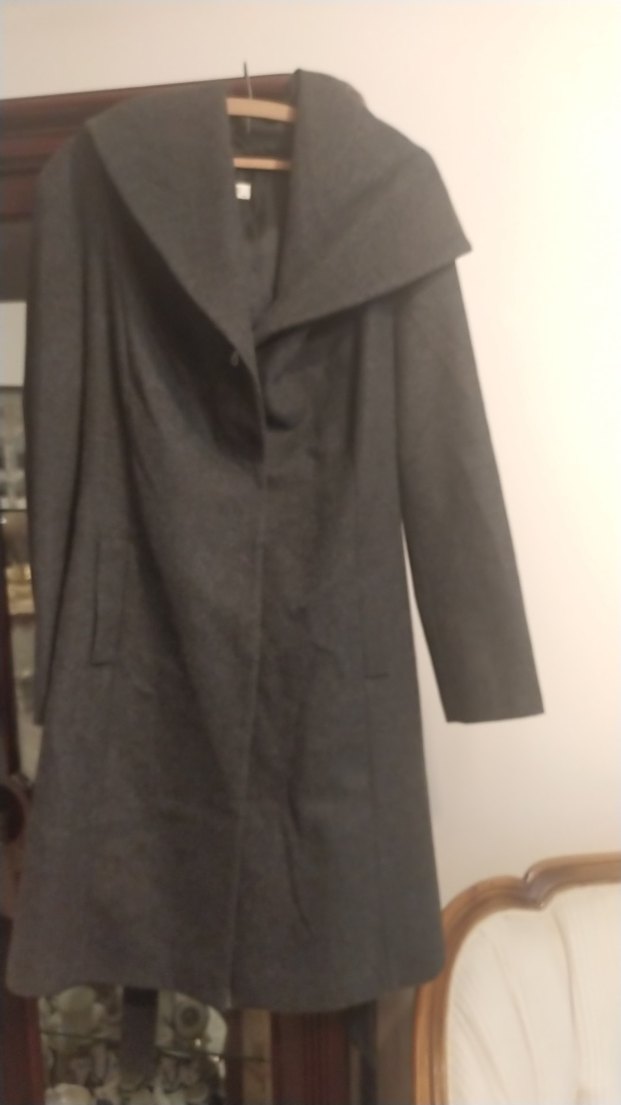Gri uzun kadın kaban, drapeli kesim ve yakalıdır. Uzun kollu, iş stiline uygun, yumuşak ve sıcak kumaştan yapılmıştır. Düz ve çağdaş tasarımlıdır.