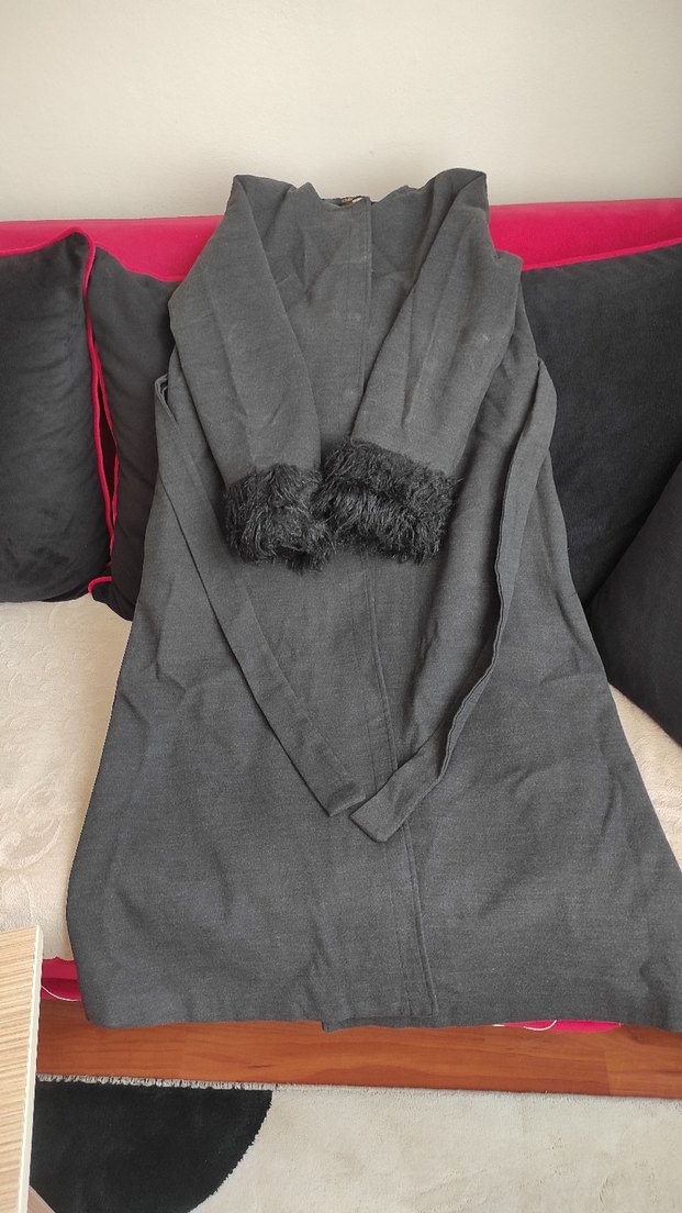 Gri uzun kaban, kürk detaylı manşetlere ve kesimli yakaya sahiptir. Yumuşak sentetik kaliteli şık yeniden farksız iki koltuk arası 49 boyu 117 hemen satılsın diye ucuza koyuyorum
