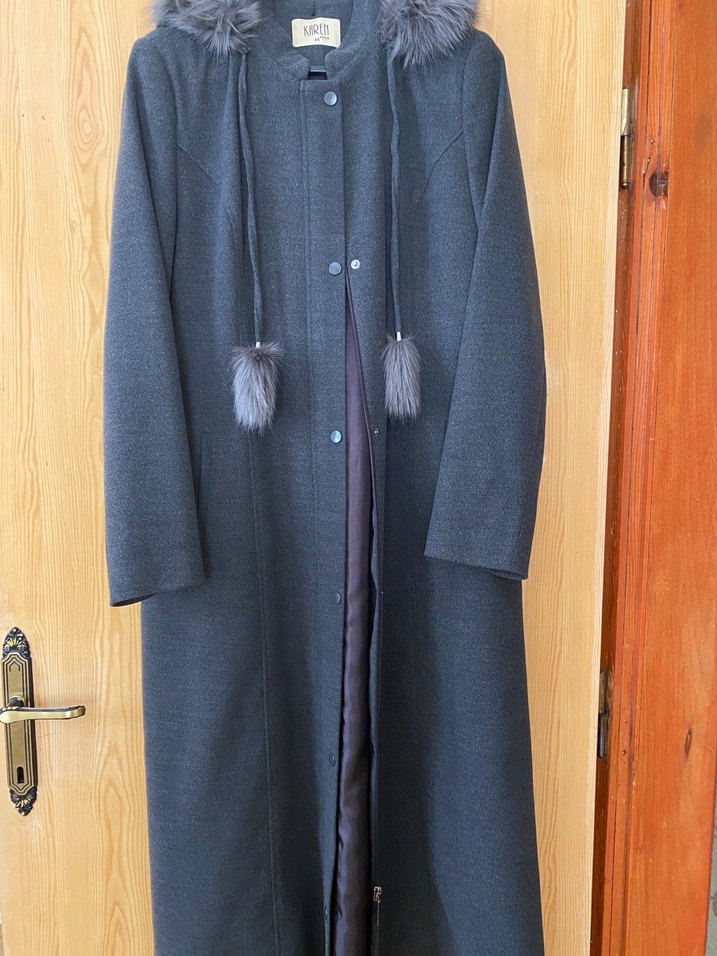 Gri uzun kadın yün kaban, kapüşonunda kürk detayları ve kesiminde klasik notched yaka ile rahat ve şık bir görünüm sunar. Ofis için uygundur ve desensizdir. ❄️0 hiç kullanılmamıştır sadece etiketi kopmuştur.