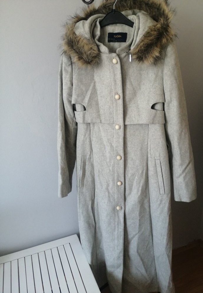 Gri uzun kadın kaban, kürklü kapüşonlu ve kesik yaka detaylıdır. Rahat kesimi ve uzun kollu tasarımıyla günlük kullanıma uygundur. #tuğba #tuğbavenn #dışgiyim #ferace #tunik #armağan #ghisa #armine #tesettür #kap #pardesü #kaban #mont #bot #lcw #koton #seçil