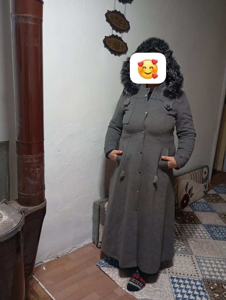 Kadınlar için gri uzun kaban, bol kesim, kesik yakalı ve uzun kolludur. Yumuşak kürklü kapüşon ve konforlu fleece kumaştan yapılmıştır, rahat sokak stili için uygundur.