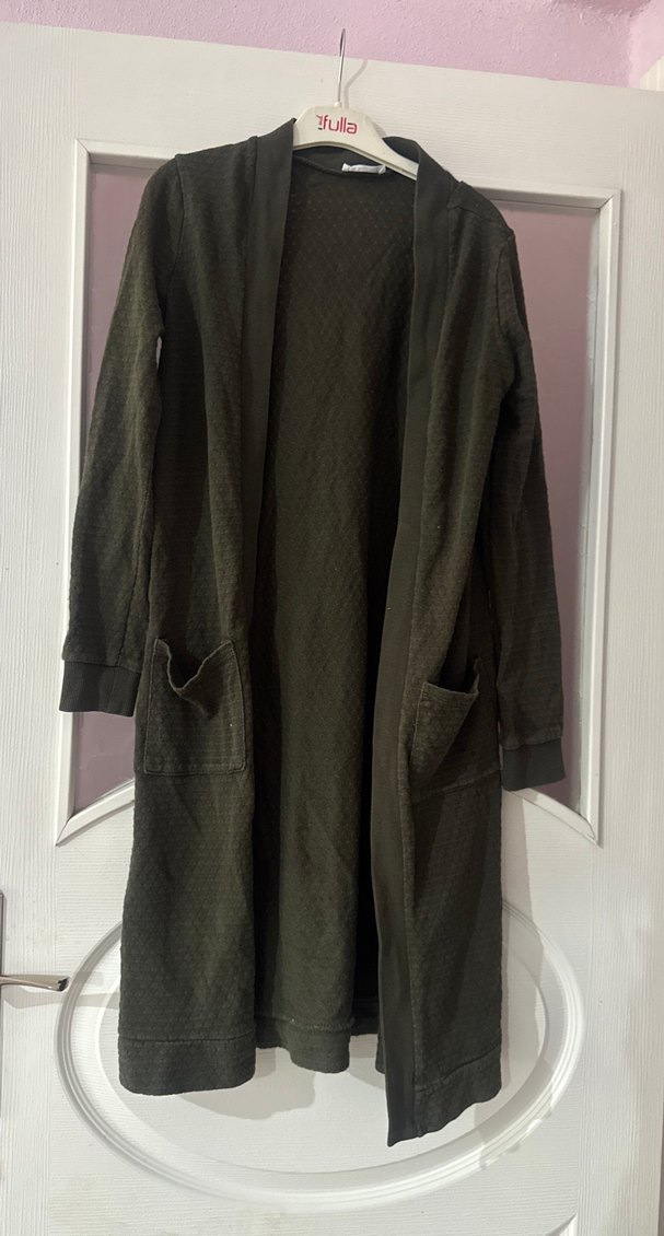Koyu gri uzun keten kadın ceket, bol kesim, uzun kollu ve yakası kesik detaylıdır. Cep ve drapeli tasarıma sahiptir, trend rahat stil için uygundur. Hırka