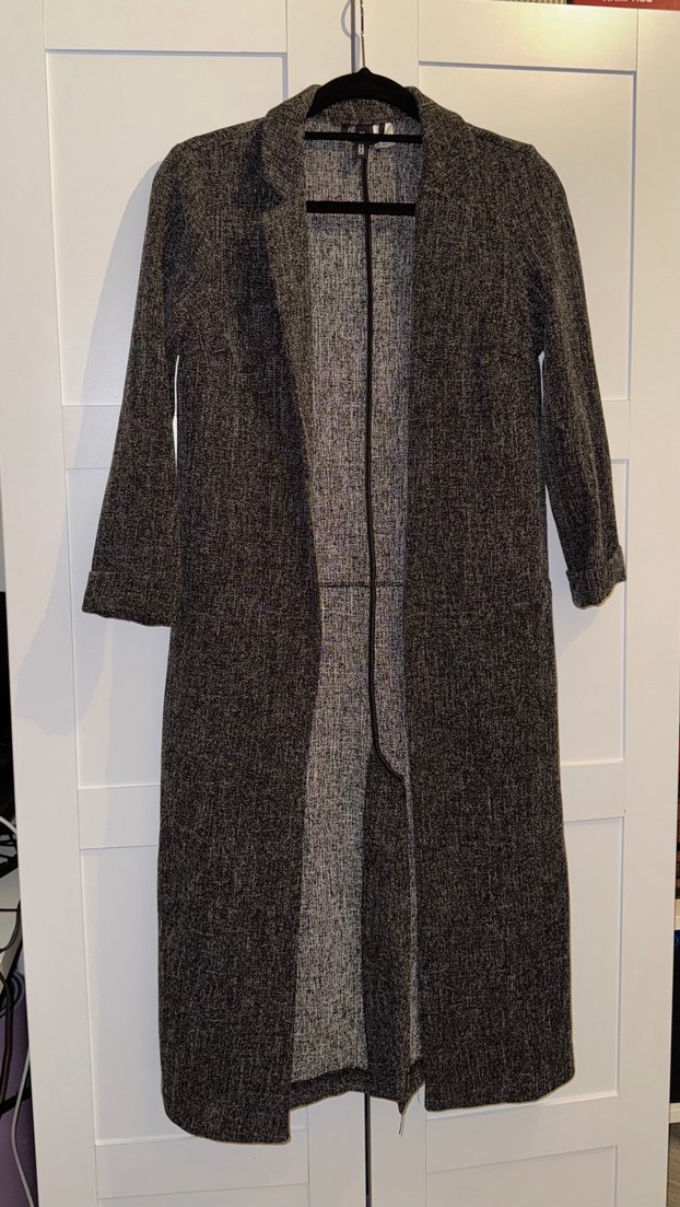 Gri keten kumaştan uzun kadın ceketi, düğmeli ve yakalı, rahat kesim ve uzun kolludur, modern ofis tarzı sunar.