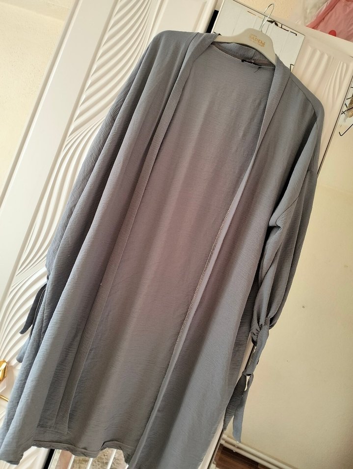 Gri renkte, bol kesim kadın kimono. Düşük yakalı, uzun kollu, sade ve bohem tarzda, günlük kullanıma uygun. 42 44 beden uyumlu. sıfırdır, yıkandı ama giyilmedi