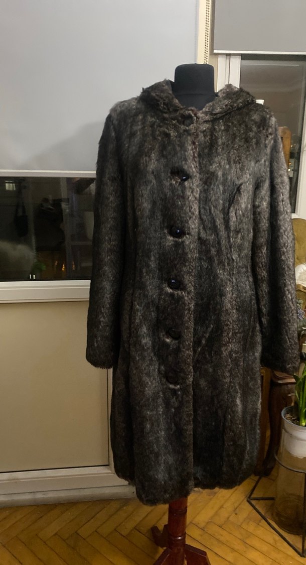 Gri uzun kadın kaban, kürk detaylı ve yaka kısmı kesik. Yün kumaştan, regular fit ve uzun kollu, ofis için uygun vintage gotik tarzda.