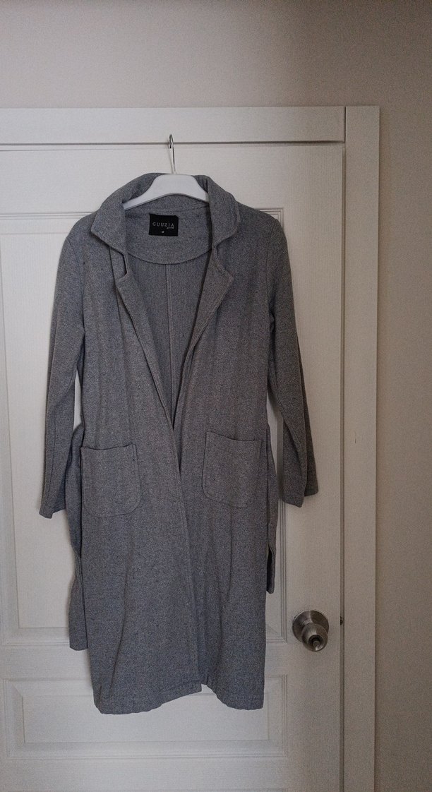 Gri uzun kadın kaban, kemerli ve cepli. Notch yaka, uzun kollu, rahat kesim ve yumuşak sıcak kumaştan üretilmiştir.
