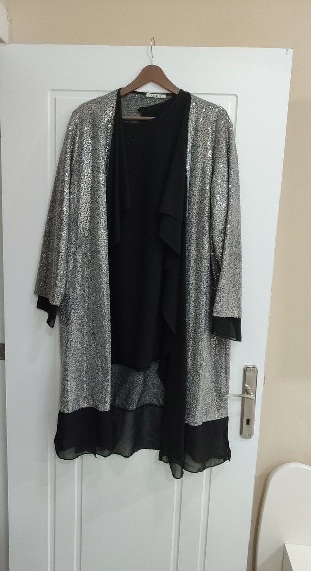 Uzun, bol kesim gri kaban, dökümlü tasarım ve ipeksi dokuyla. Uzun kollu, yaka kısmı kesik detaylı, desensiz ve ofis için uygun.