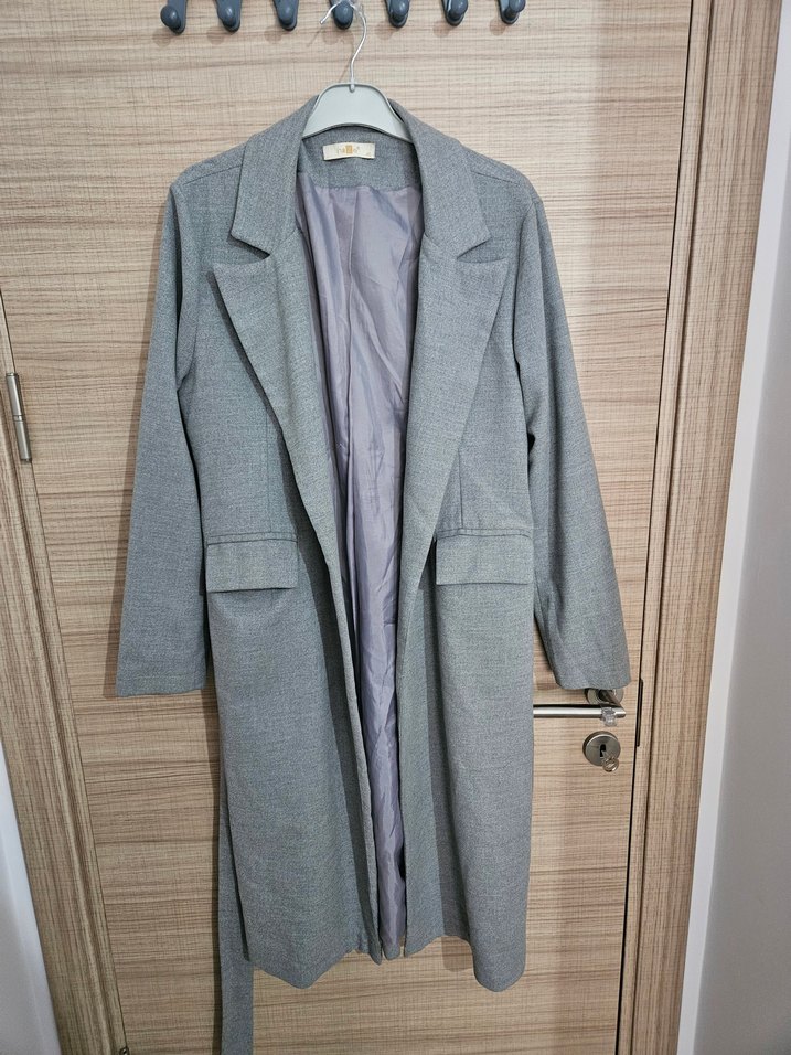 Klasik yaka ve önü cepli uzun gri pardesü trençkot. İç kısmı astarlı ve belden bağlamalıdır, soğuk havalar için uygundur.