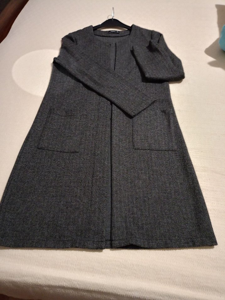 Gri renkte, uzun ve triko dokulu kadın kaban. Düz ve desen içermeyen, normal kesim ve uzun kollu, günlük kullanıma uygun.