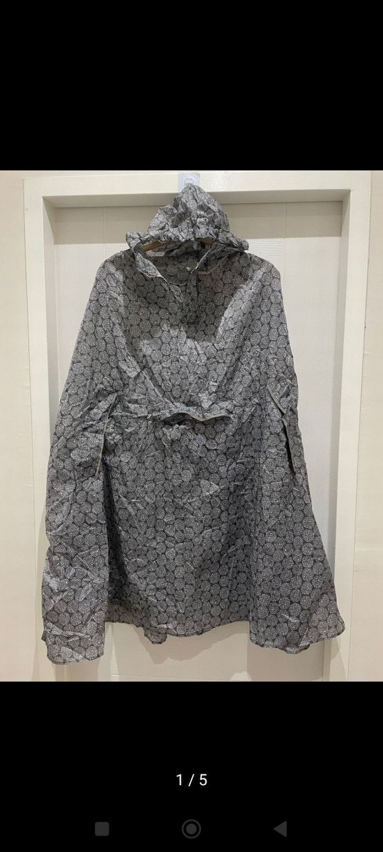 Kadın yağmurluğu, bol kesim ve drapeli tasarıma sahip. Yüksek yakalı, uzun kollu, sentetik kumaştan gri renkte, sokak stiline uygun.
