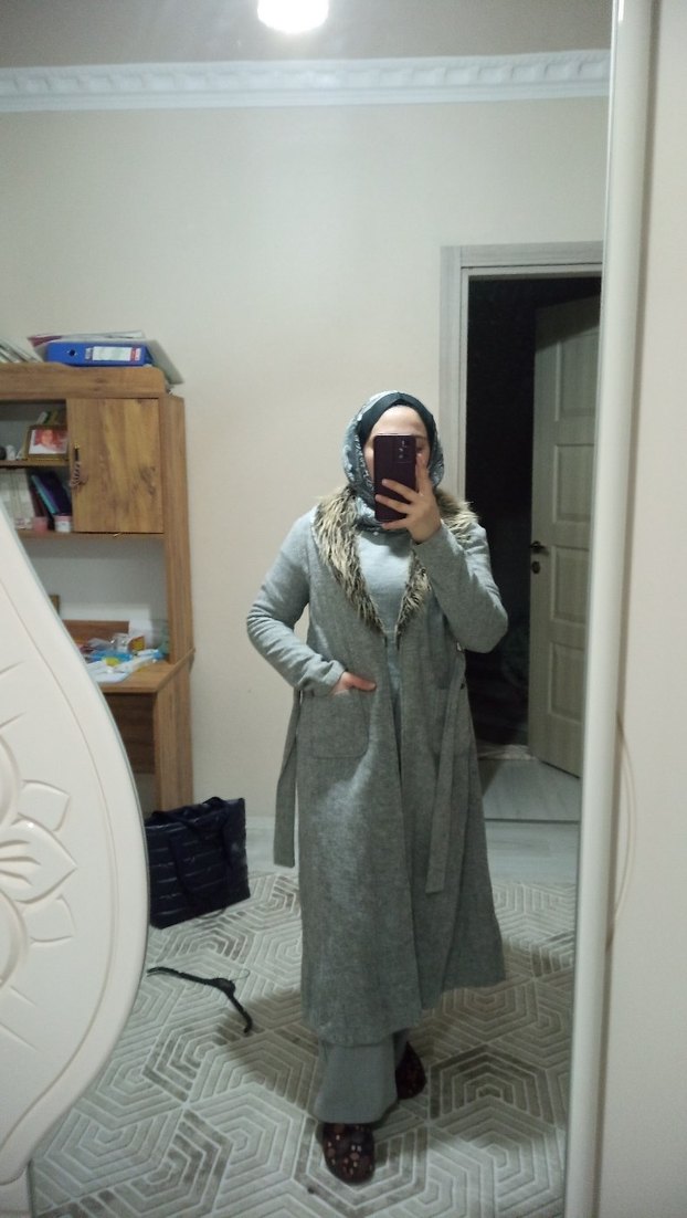 Gri uzun yün kaban, bol kesim, uzun kollu ve boğazlıdır. Yumuşak kürk detaylı yakasıyla günlük kullanıma uygundur.