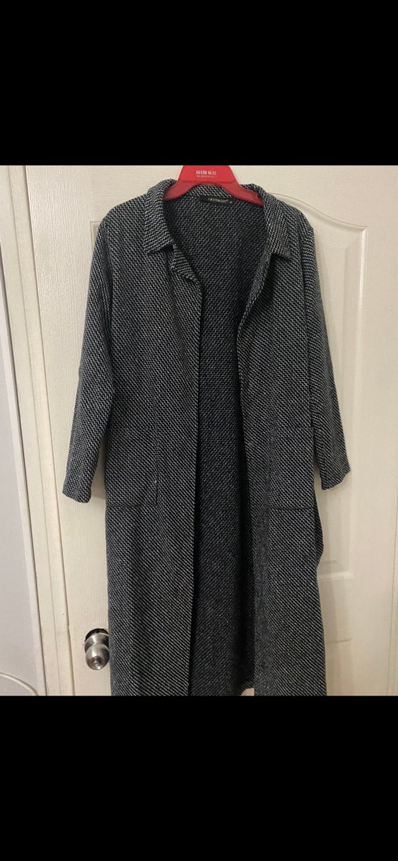 Gri uzun yün kaban, kesimli yakası ve düğmeli kapamasıyla rahat bir görünüm sunar. Uzun kollu, günlük kullanıma uygundur.