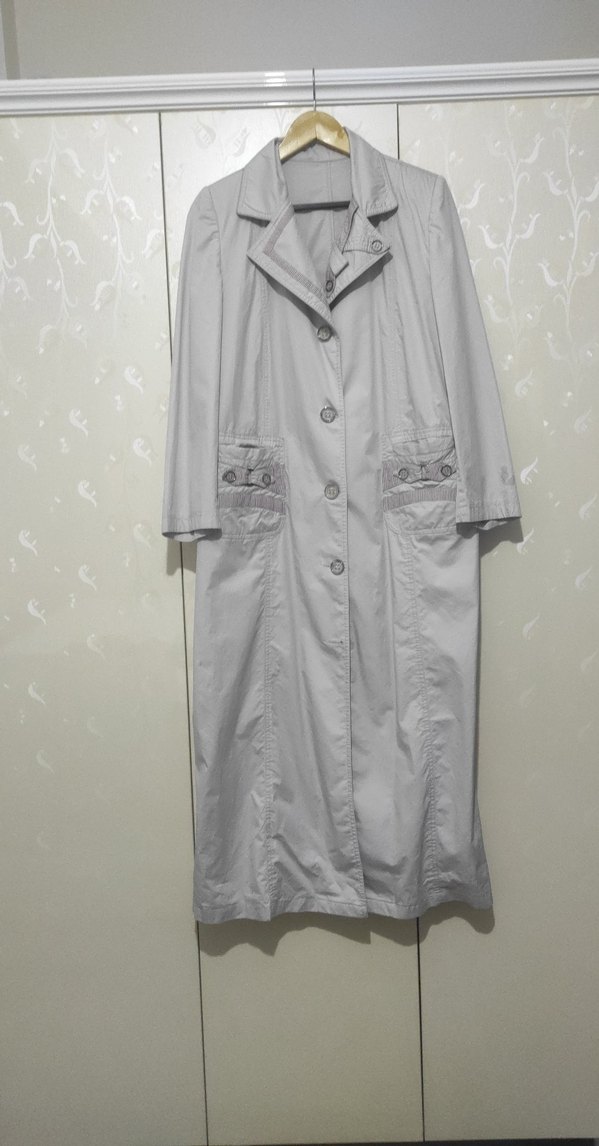 Gri uzun kaşe kadın manto. Hiçbir defosu yoktur şık ve zarif duruyor.