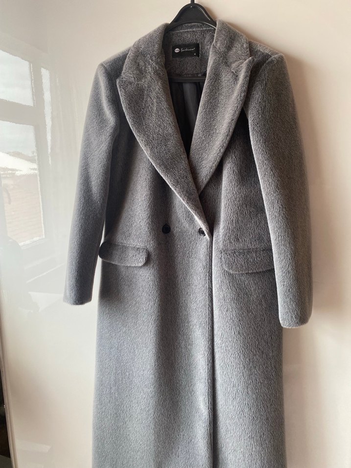 Kaşmir dokulu yumuşak, ön cepli gri uzun kaban. Klasik ve şık bir tasarıma sahiptir.