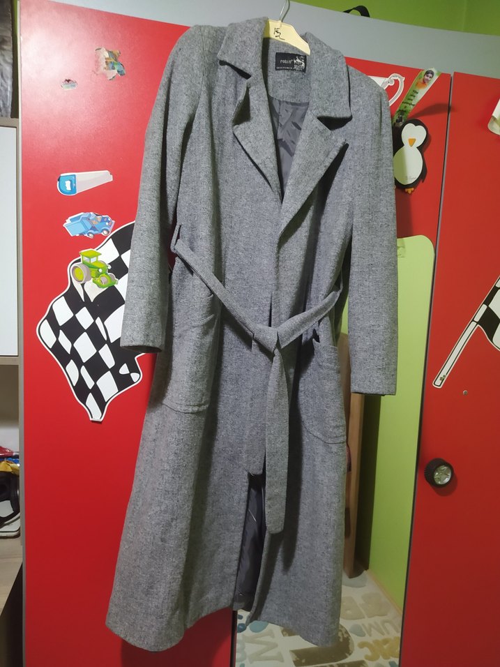 Kemerli ve yaka detaylı uzun gri kaban, klasik ve rahat bir kullanım sağlar.