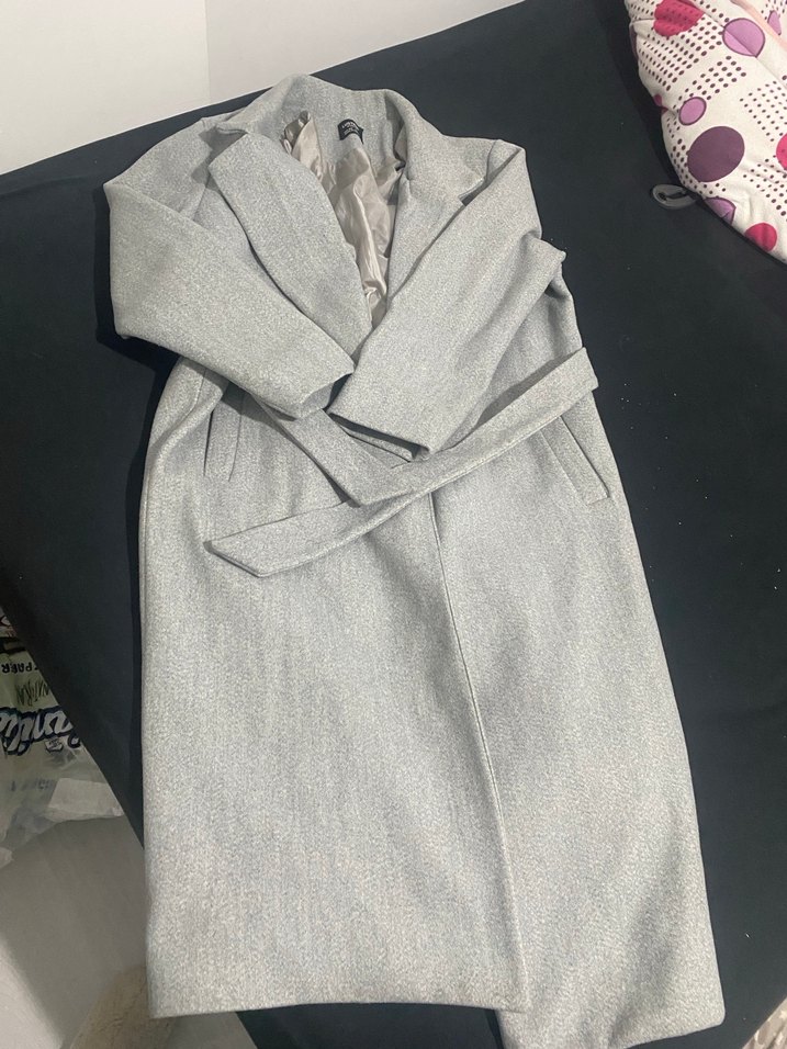 Uzun gri kaban, kemerli ve yumuşak astarlı, rahat ve klasik bir görünüm sunar. Çok az kullanıldı çok iyi durumda