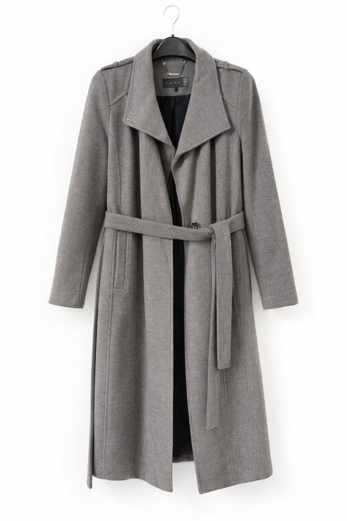 Geniş yakalı, kemerli ve yan cepli gri kaban