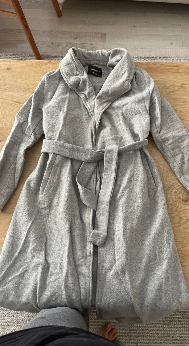 Yumuşak kumaştan uzun gri kaban, kemerli ve şal yaka detaylı, soğuk havalar için uygun.