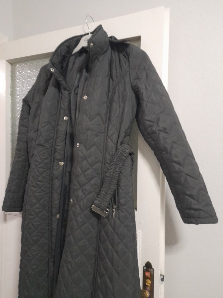Haki renkte, uzun kesim, kemerli ve askılı kollu kadın kışlık mont. Yumuşak sentetik kumaştan, regular fit ve notched lapel yakaya sahip, günlük sokak stili için uygun. ❄️
