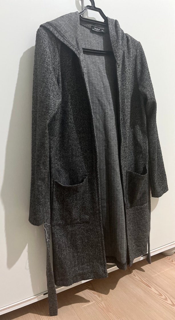 Gri uzun kesim hırka, yakası kesik ve uzun kolludur. Yumuşak,rahat kesimi ve drapeli stiliyle günlük sokak modasına uygundur. İki cep içerir