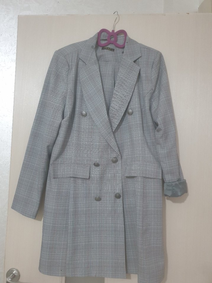 Gri renkli, düğmeli, uzun kesim kadın blazer taķım. Notlu yaka ve askılı kollara sahip, rahat kesim, ofis ve günlük sokak stili için uygundur.
