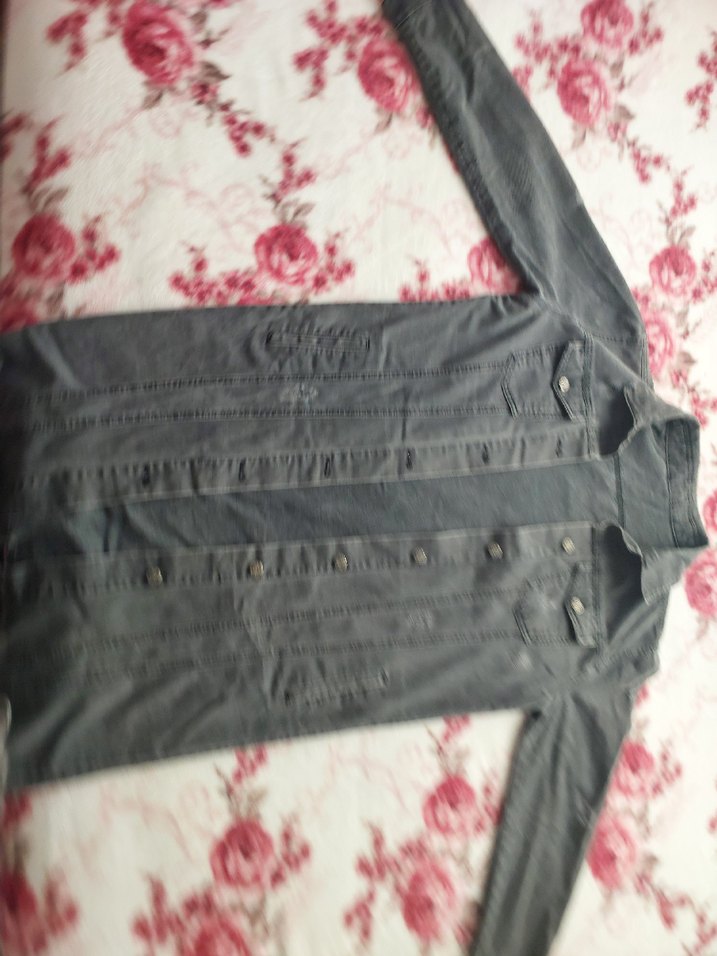 Düğmeli, uzun kollu, yakalı ve uzun kesim fitted kadın kot ceket. Gri renkte, desen içermeyen, trend sokak stili için uygun.